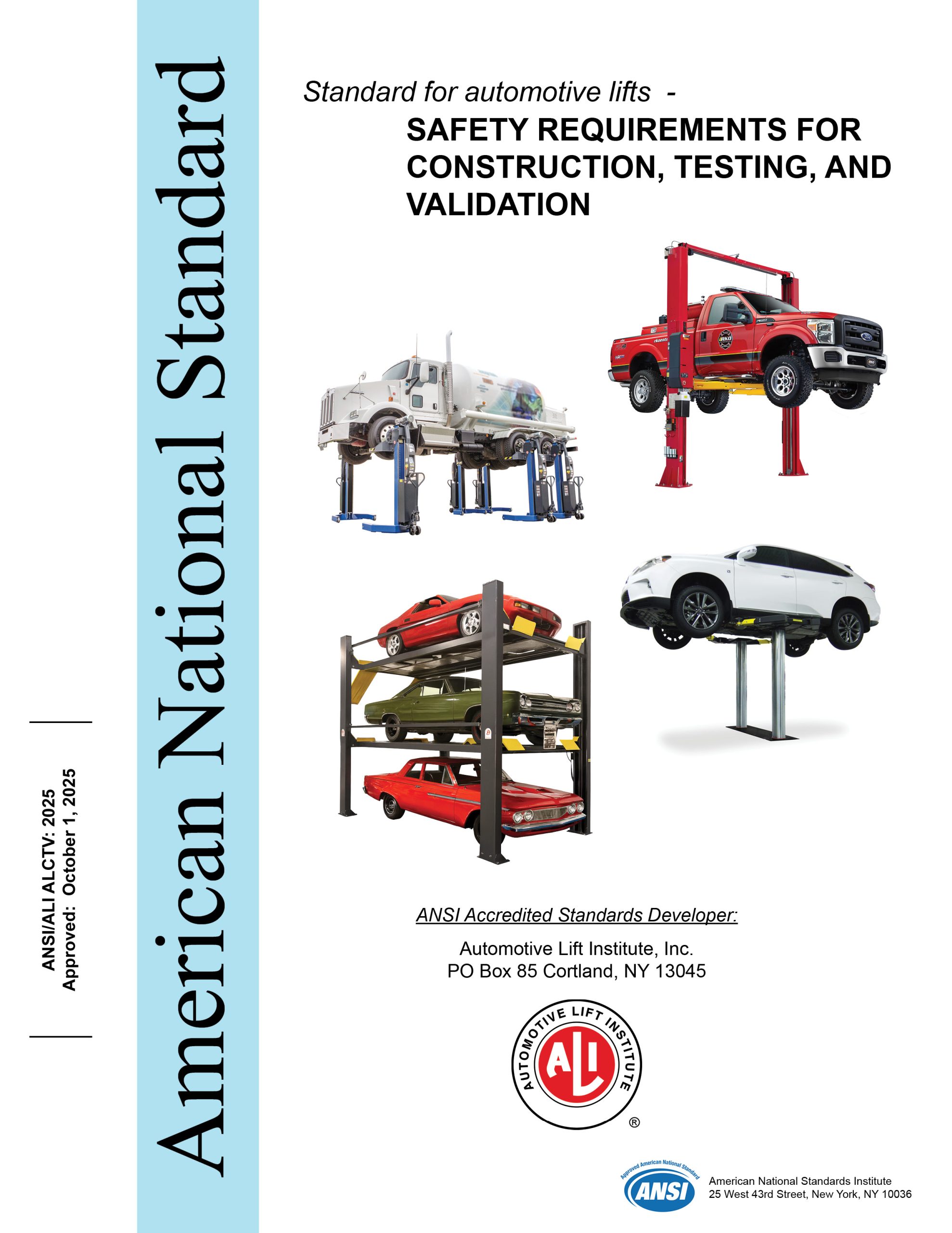 The American National Standards Institute, Inc. (ANSI) approved this standard on October 1, 2025. Approval requires verification by ANSI that the requirements for due process, consensus, and other criteria for approval have been met by the standards developer. ALI is the ANSI Accredited Standards Developer* and sponsor of ANSI/ALI ALCTV, as well as its companion standards ANSI/ALI ALOIM “Standard for Automotive Lifts – Safety Requirements for Operation, Inspection and Maintenance,” and ANSI/ALI ALIS “Standard for Automotive Lifts – Safety Requirements for Installation and Service.”